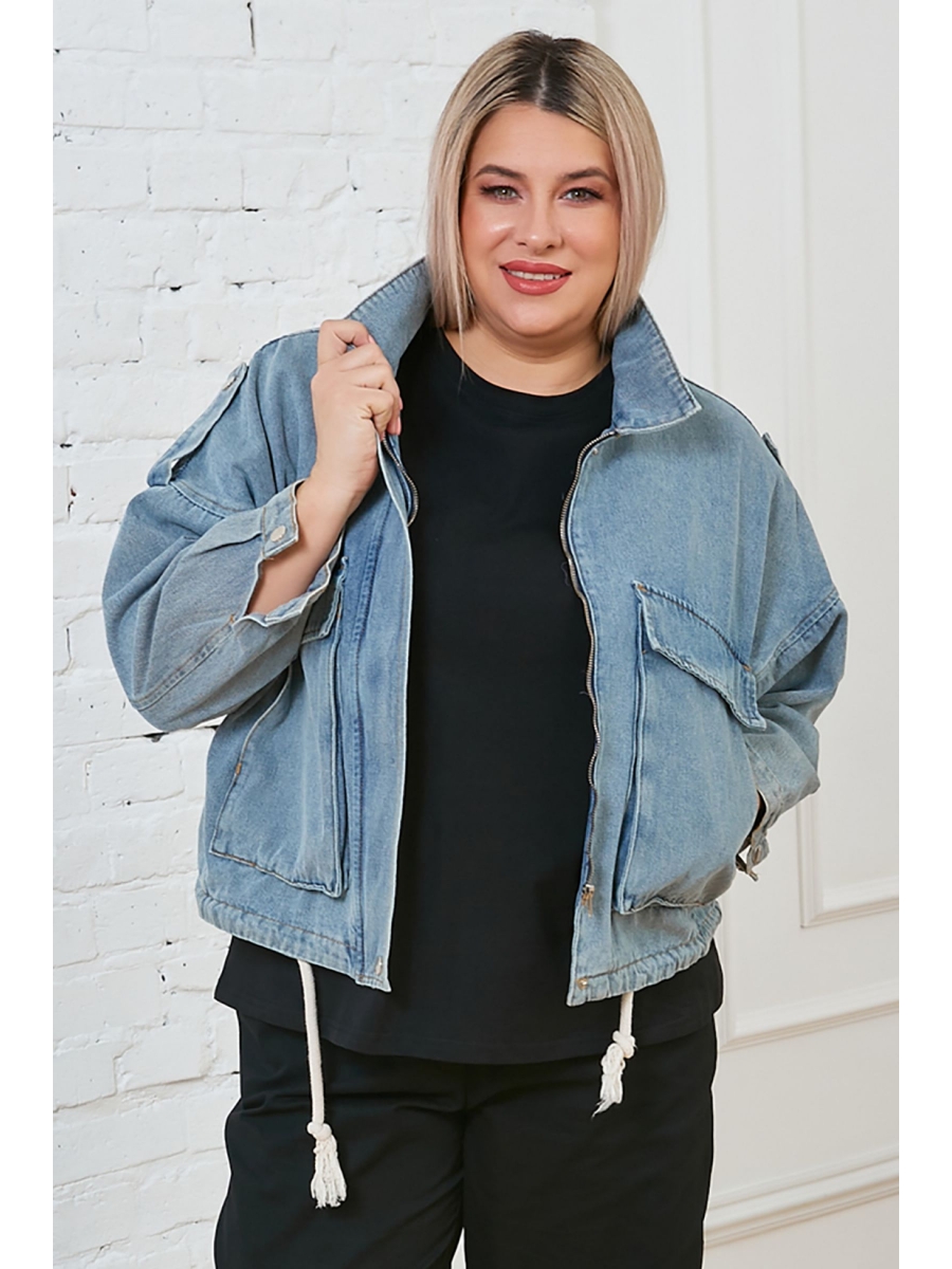 Стильная укороченная куртка из вареной джинсы. Модель с центральной застежкой на молнию и планку с кнопками. Горловина оформлена отложным воротником. По переду большие накладные карманы с клапаном. Линия плеча спущенная, дополнена погоном. Рукав укороченный, длиной 7/8, по низу оформлен манжетой с застежкой на петлю и пуговицу. Низ изделия ровный дополнен кулиской. Отличное дополнение к гардеробу в прохладные вечера.