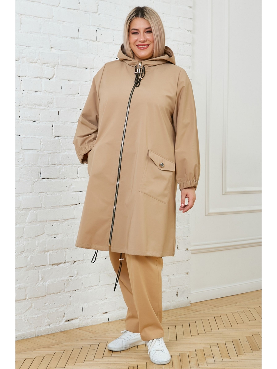 Стильная парка трапециевидного силуэта из плащевой однотонной ткани. Круглый вырез горловины дополнен шлемовидным капюшоном со шнуром и фиксаторами. По переду - центральная застежка на тесьму-молнию. Длинные втачные рукава, с широкой резиной по низу. По переду большие накладные карманы с клапанами, удобно расположенные по линии бедер. Спинка со швом по центру, оканчивающимся разрезом. Низ ровный дополнен шнуром и фиксаторами.