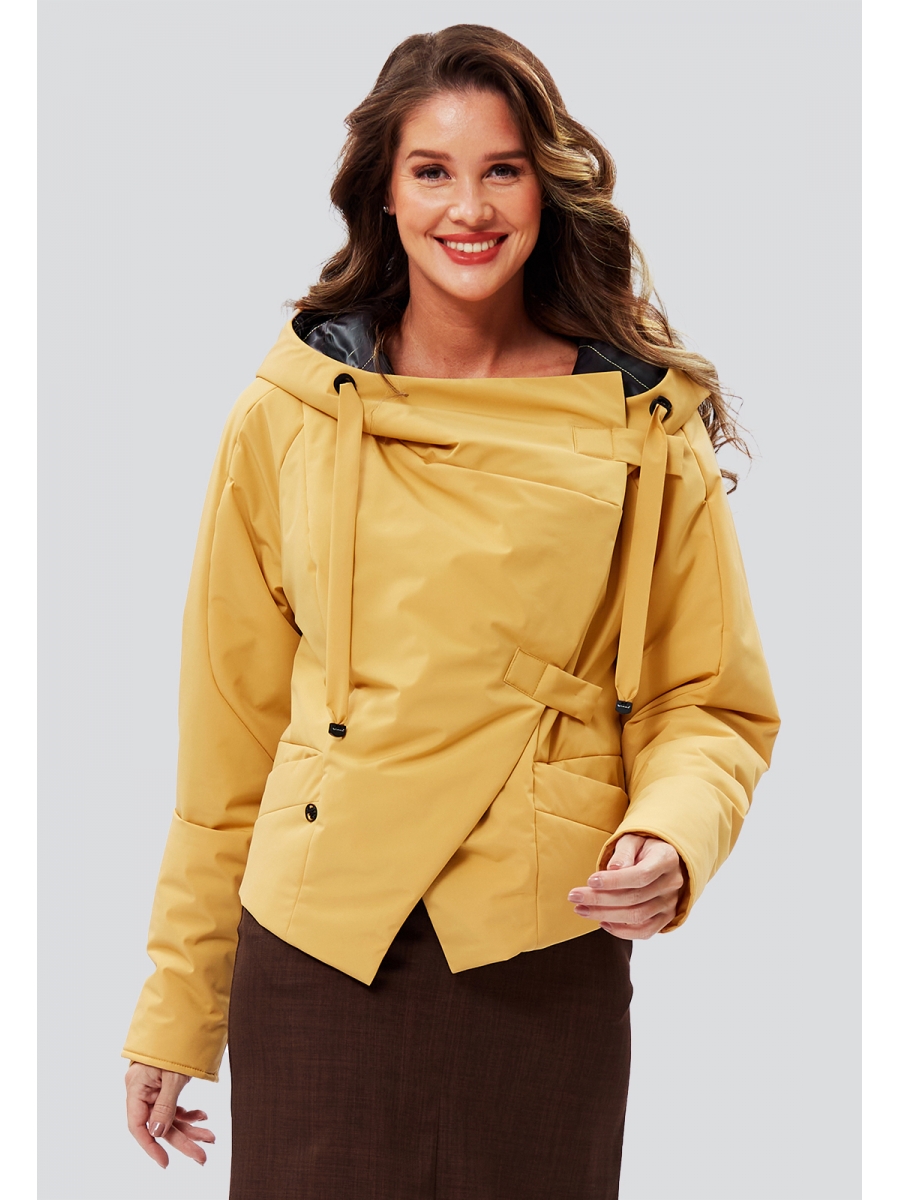 Дизайнерская куртка в Casual-стиле с утеплителем ТерМакс. Благодаря особой обработке каландером, утеплитель тонкий и лёгкий. Модель с комбинированным рукавом и несъемным капюшоном со шнурком, регулирующим объем капюшона, переходящим в воротник-апаш. Асимметричная застежка на паты с кнопками и фигурная стежка необычной конструкции . На полочках прорезные карманы с листочками. Контрастный черный подклад со стежкой в цвет верха. Низ куртки разновеликий с уголками-мысиками по полочкам.