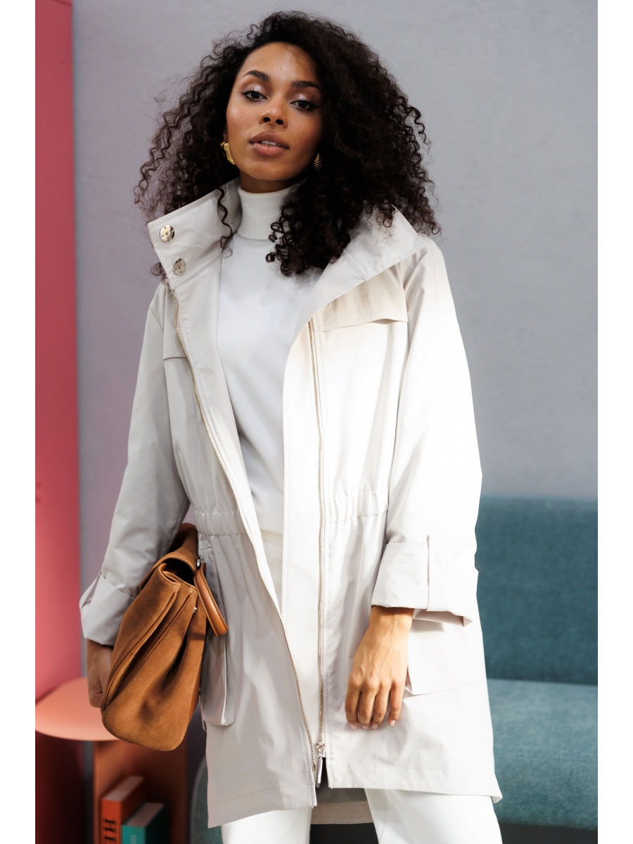 Эта легкая куртка – идеальный баланс между стилем и комфортом. Выполненная в универсальном светлом оттенке, она придает образу свежесть и элегантность, а свободный силуэт с утяжкой на талии подчеркивает фигуру, создавая женственный силуэт. Эта куртка станет стильной основой для любого весенне-осеннего гардероба!