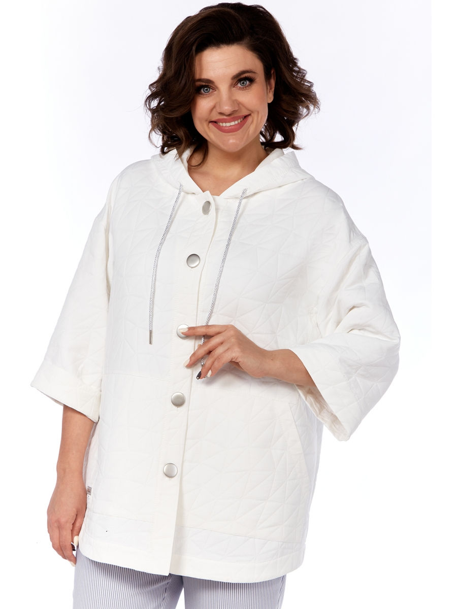 Блейзер женский свободного силуэта, изготовлен из фактурной ткани. Изделие с капюшоном, застежка центральная на петли и пуговицы, низ фигурный на обтачке. Перед с фигурными подрезами, карманы накладные. Спинка разрезная по линии талии. Рукава спущенные с отложной манжетой.