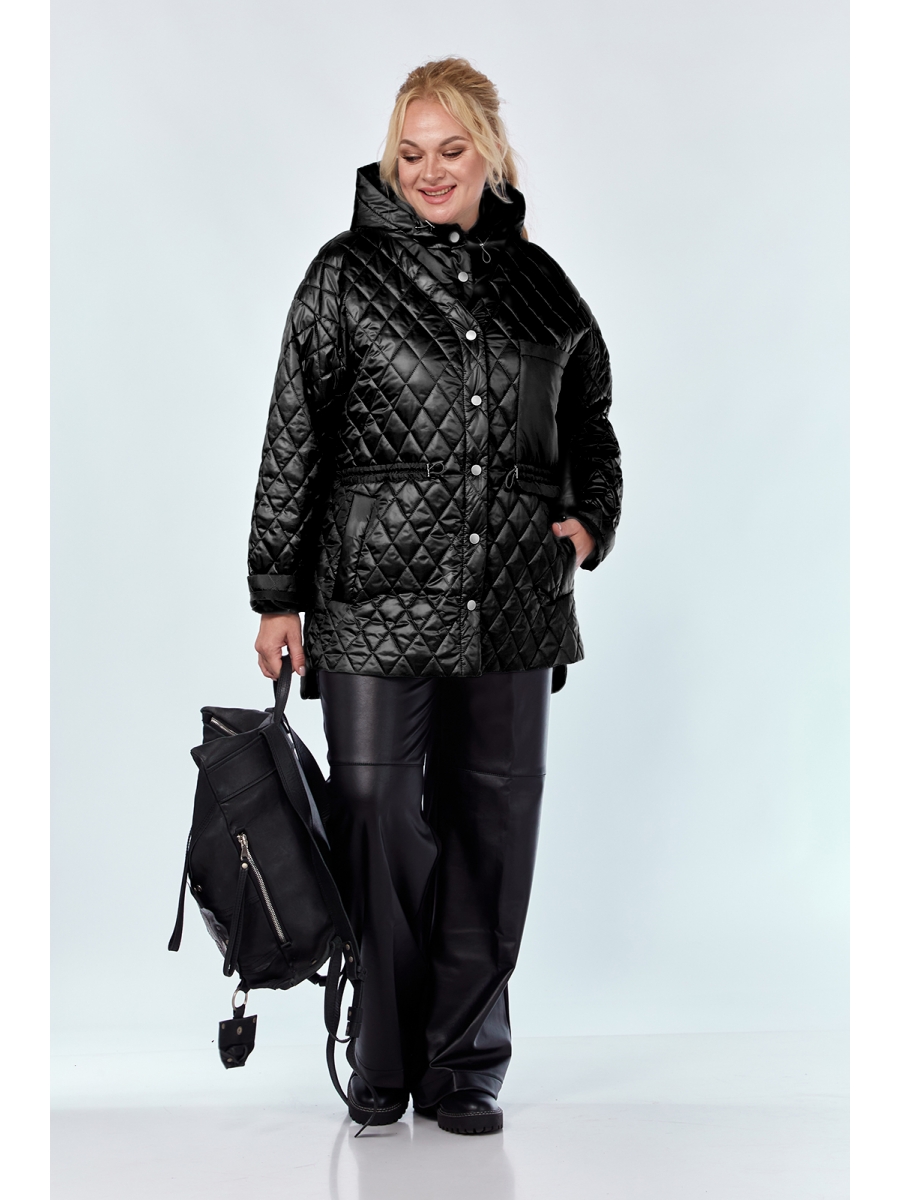 Куртка женская стеганная с капюшоном, утеплитель файбертек ( 100г/м², до -5°C ) свободного силуэта. Застежка центральная на пробивные кнопки. Полочка с фигурной вставкой из отделочной ткани, с накладным карманом и декоративными кулисами. Имеются прорезные карманы с листочкой. Спинка цельная. Рукава спущенные. Низ фигурной формы.