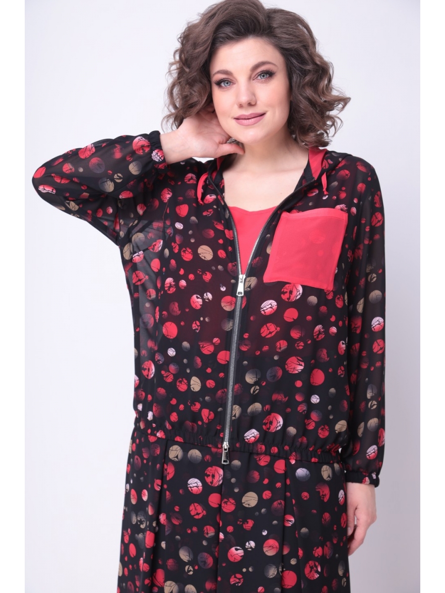 Куртка женская выполнена из шифоновой ткани. Нарядная. По переду вставлена декоративная отделочная молния. По спинке капюшон. Рукав втачной длинный с манжетой резинкой. Низ куртки тоже отделан манжетой.