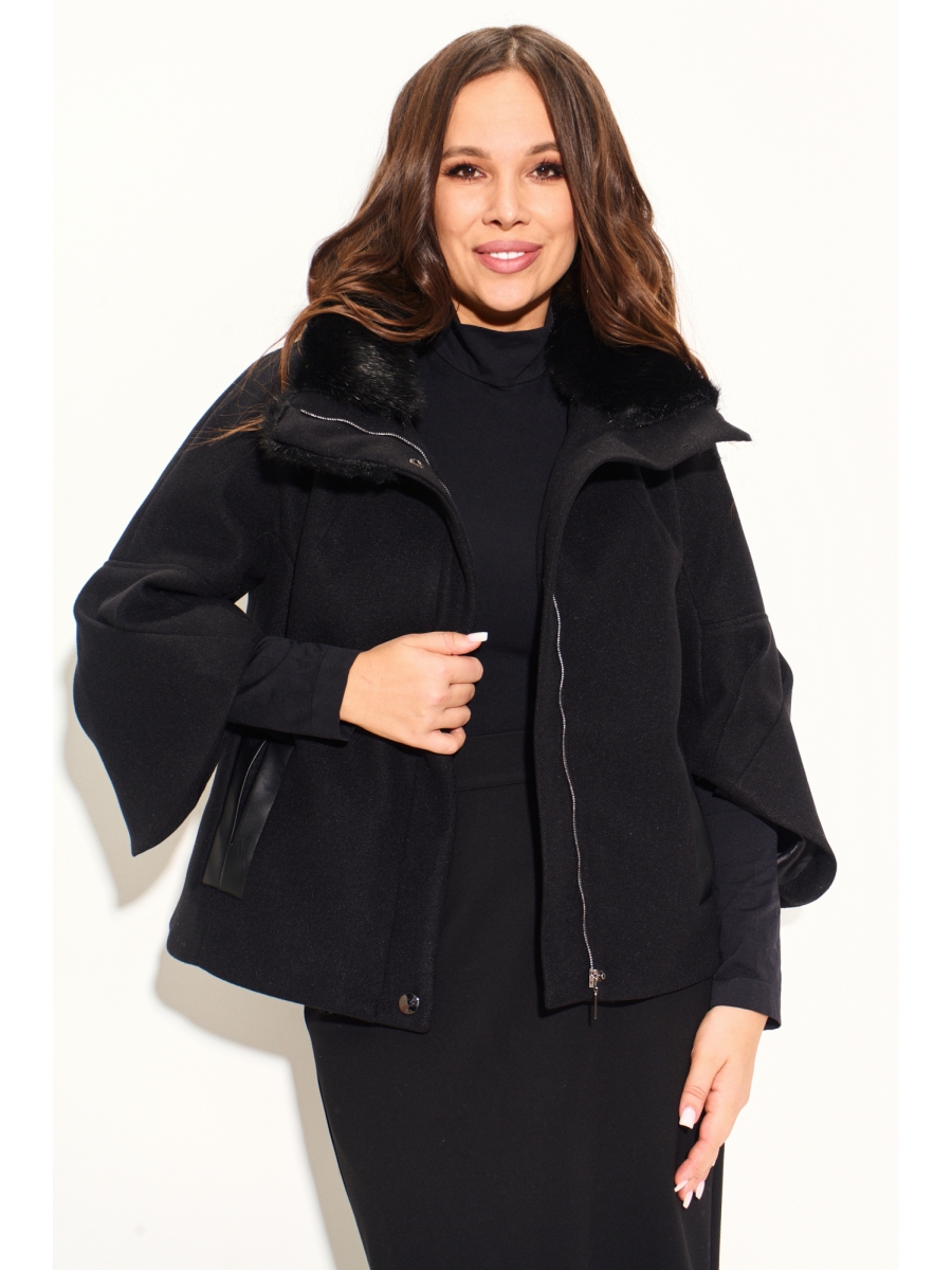 Женское полупальто (автоледи) полуприлегающего силуэта на подкладке с меховым воротником (искусственный мех с эффектом натурального). По переду прорезные функциональные карманы с отделкой из ЭКО-кожи, по линии горловины выточки, рукава цельнокроеные с отрезной манжетой и мягкими складками по низу рукава, которые добавляют изысканности и украшают руку; застежка на молнию и кнопки. Полупальто полностью соответствует заявленному размеру.