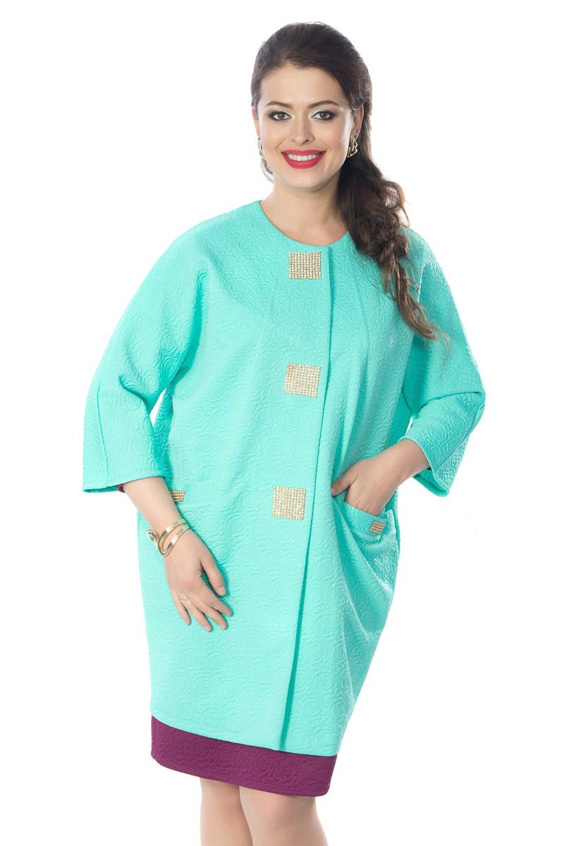 Роскошное пальто свободного силуэта из трикотажного полотна зеленого цвета с рельефной фактурой. Круглый вырез изделия обработан внутренней обтачкой. Пальто с цельнокроеными рукавами и с карманами. Перед изделия и карманы украшены металлическими элементами. Пальто с застежкой на кнопки по переду.