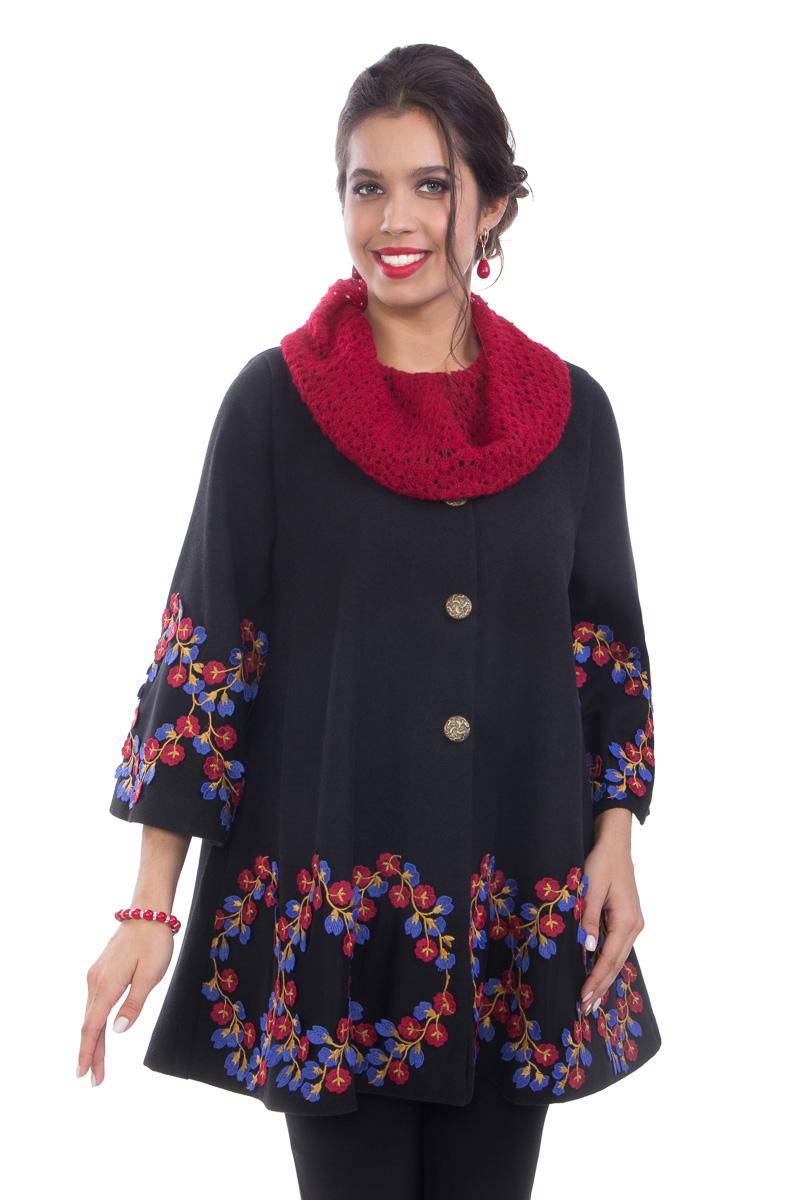 Стильное пальто А-силуэта из плотного текстильного полотна черного цвета. Круглый вырез изделия обработан внутренней обтачкой. Пальто с втачными рукавами длиной 3/4. По переду изделия планка с застежкой на пуговицы. Низ рукавов и перед пальто дополнены кружевной аппликацией сине-красного цвета. В боковых швах изделия втачные карманы. Пальто без подклада.