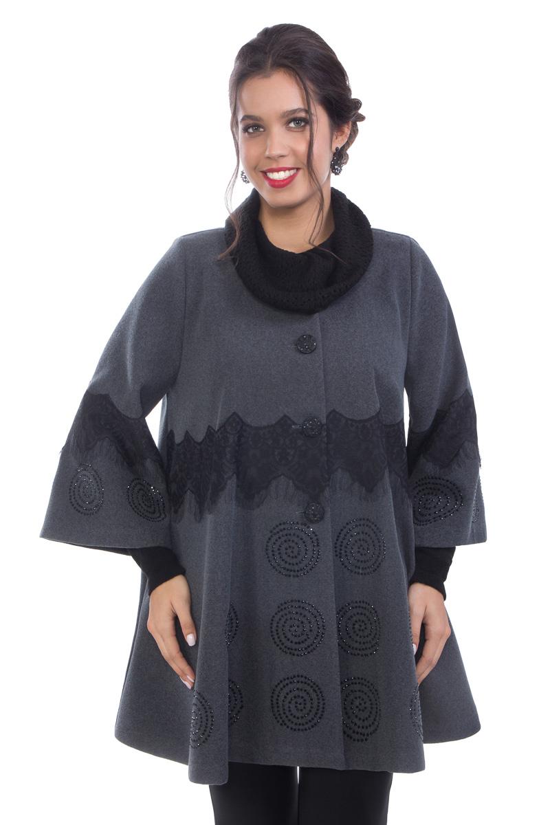 Стильное пальто А-силуэта из плотного текстильного полотна темно-серого цвета. Круглый вырез изделия обработан внутренней обтачкой. Пальто с втачными рукавами длиной 3/4. По переду изделия планка с застежкой на пуговицы. Низ рукавов и перед пальто дополнены тонким кружевом черного цвета и стразами. В боковых швах изделия втачные карманы. Пальто без подклада.