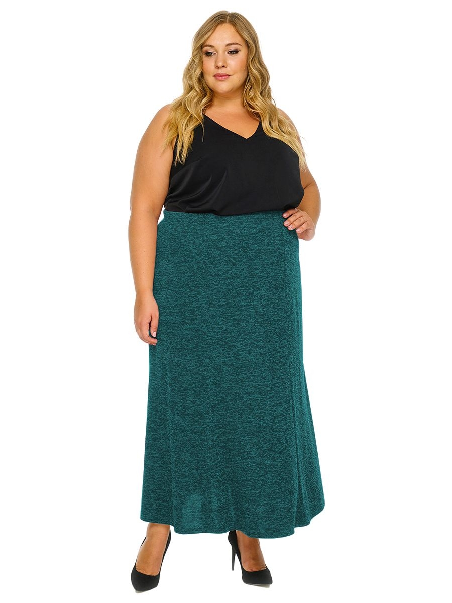 Длинная юбка силуэта годе из меланжевого джерси, на подкладке. За счет клиньев, расширяющихся к низу, юбка зрительно вытягивает силуэт. Верх на широкой резинке, не стесняющей движение.