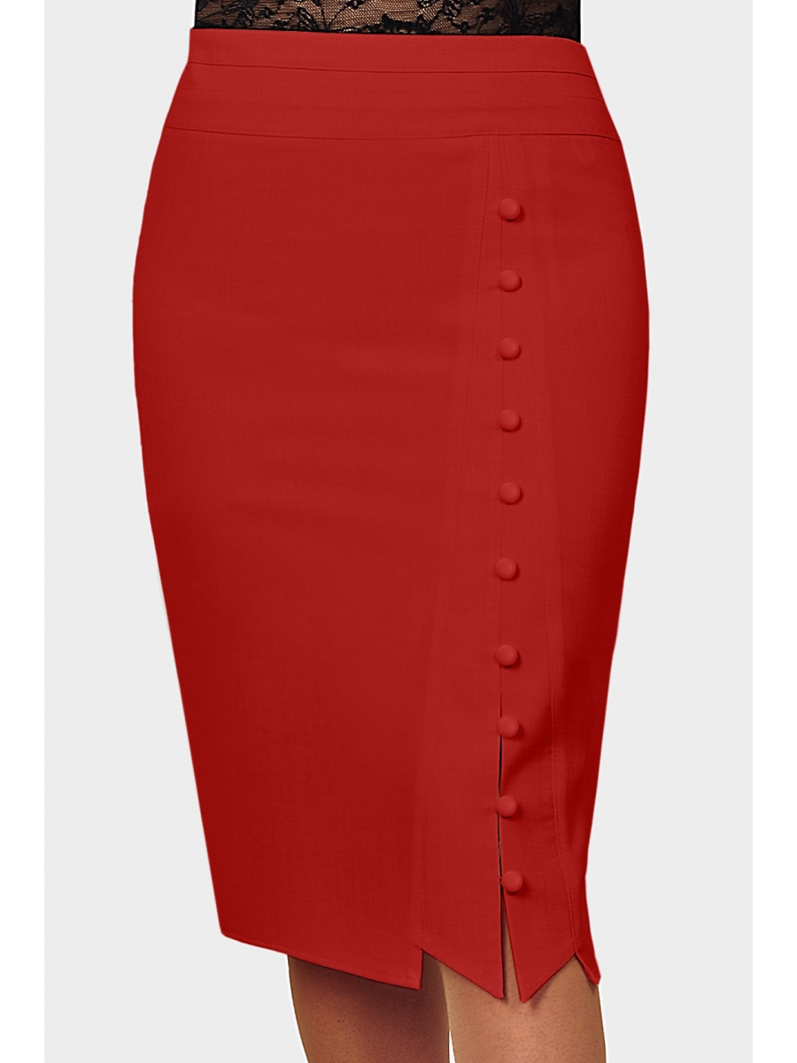 "Юбка на подкладке, по спинке потайная молния и шлица. По передней части вертикальная деталь в виде клина и к ней пришиты пуговицы -8 шт.