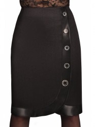 Оформить заказ →Юбка классический карандаш. На подкладке. По спинке две вытачки и шлица, в центральный шов вставлена застежка потайная молния. По передним частям центральный шов и боковые рельефные швы. По передней части к поясу пришиты клапаны с пуговицами, вставлены декоративные металлические молнии. Бережная стирка при 30 градусах.