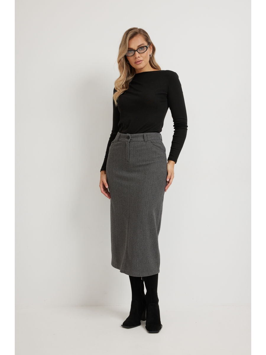 Тёплая юбка с рисунком "ёлочка" полуприлегающего силуэта длиной миди зимнего ассортимента от белорусского производителя. Ткань мягкая и очень приятная к телу. Юбка с притачным поясом, с застёжкой на тесьму-молнию и пуговицу на поясе. На передней половинке внутренние карманы, на задней половинке расположены кокетка и накладные карманы.
