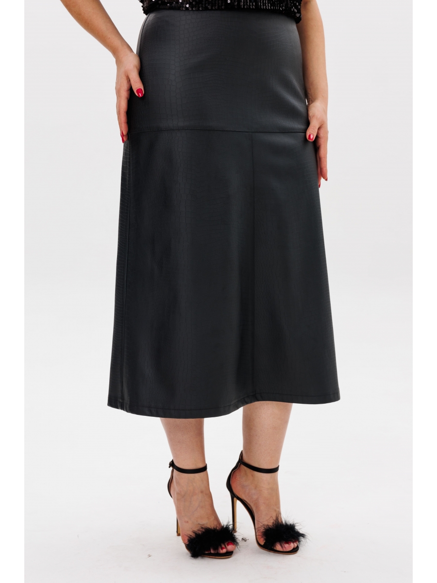 Потайная молния в боковом шве гарантирует аккуратный внешний вид и легкость в надевании. Эко кожа не только улучшает внешний вид, но и придает юбке дополнительную структуру.