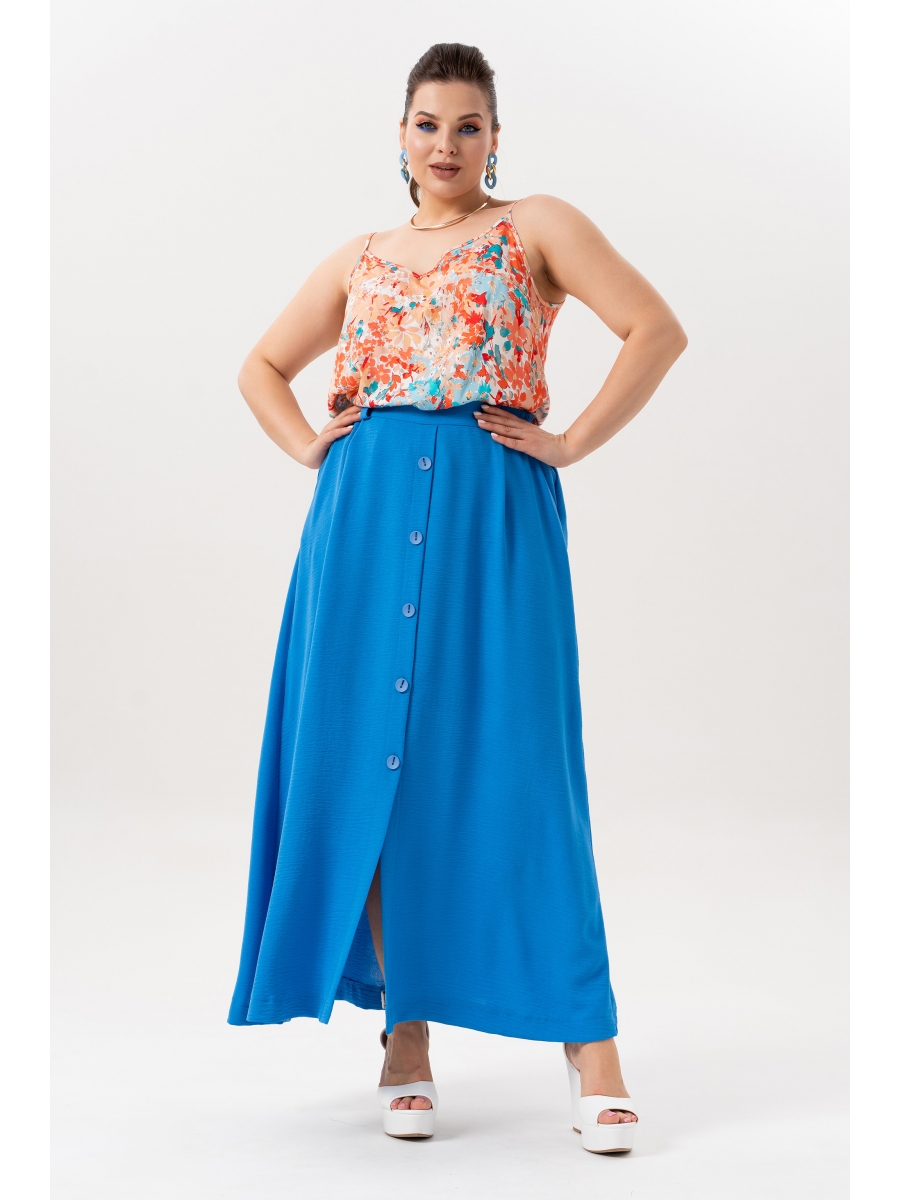 Юбка на поясе по полочке с двумя шлёвками, по спинке на резинке. Юбка по переду на пуговицах, с боковыми наклонными карманами.