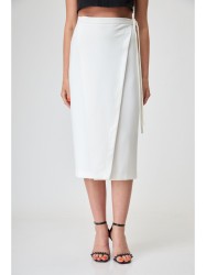 Юбка с элементом запаха, на притачном поясе. Выполнена из костюмной ткани в чёрном цвете, без подкладки. В новейших моделях запах располагается спереди сбоку. Это формирует изящный вырез треугольной формы, который смотрится очень женственно.