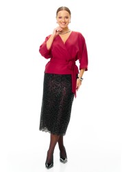 Юбка из плотного черного кружева на красной саржевой подкладке зауженная к низу с разрезом по спинке. Застежка «потайная молния» по среднему шву спинки. Верх на обтачке.