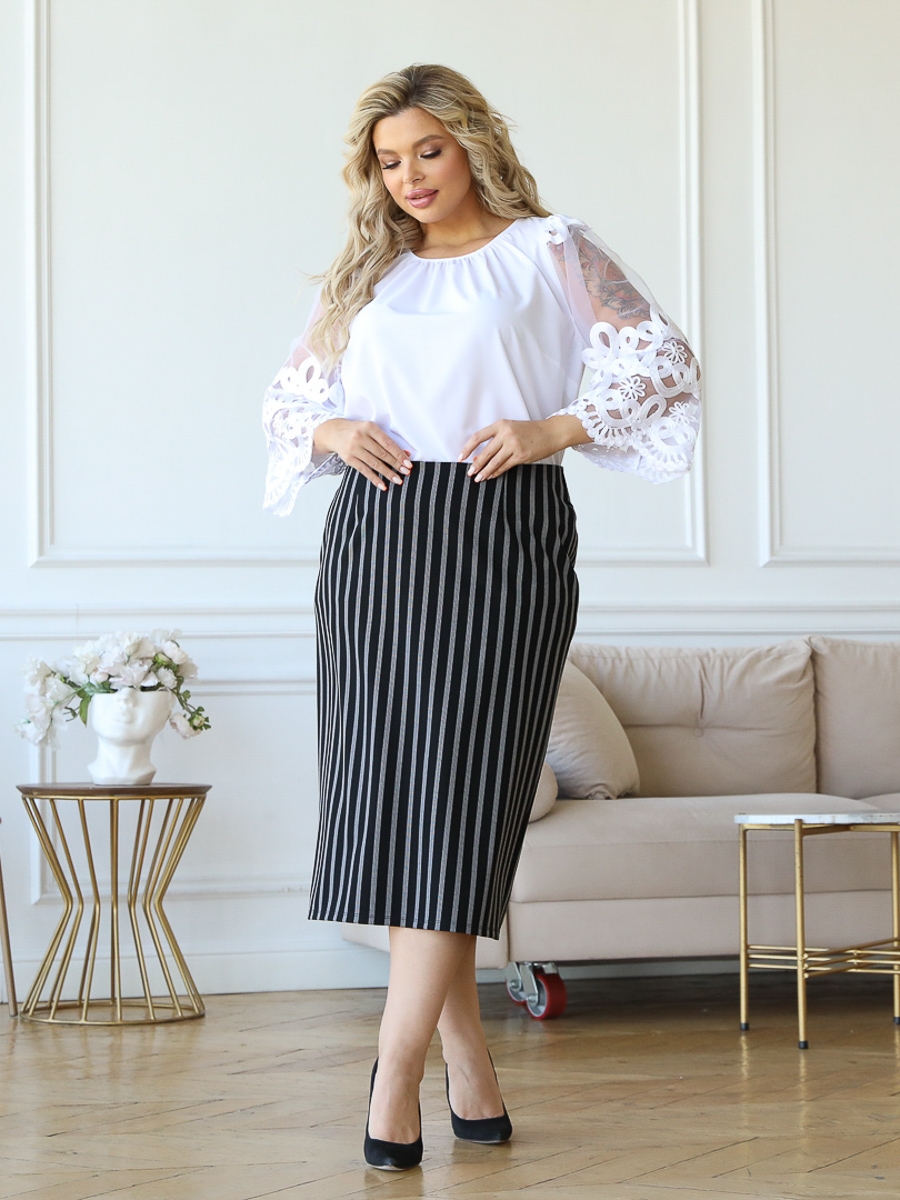Стильная юбка прилегающего силуэта из плотного трикотажного полотна черно-серого цвета. Верхний срез юбки обработан внутренней обтачкой, застежка по спинке на потайную молнию. По спинке изделия — размер.