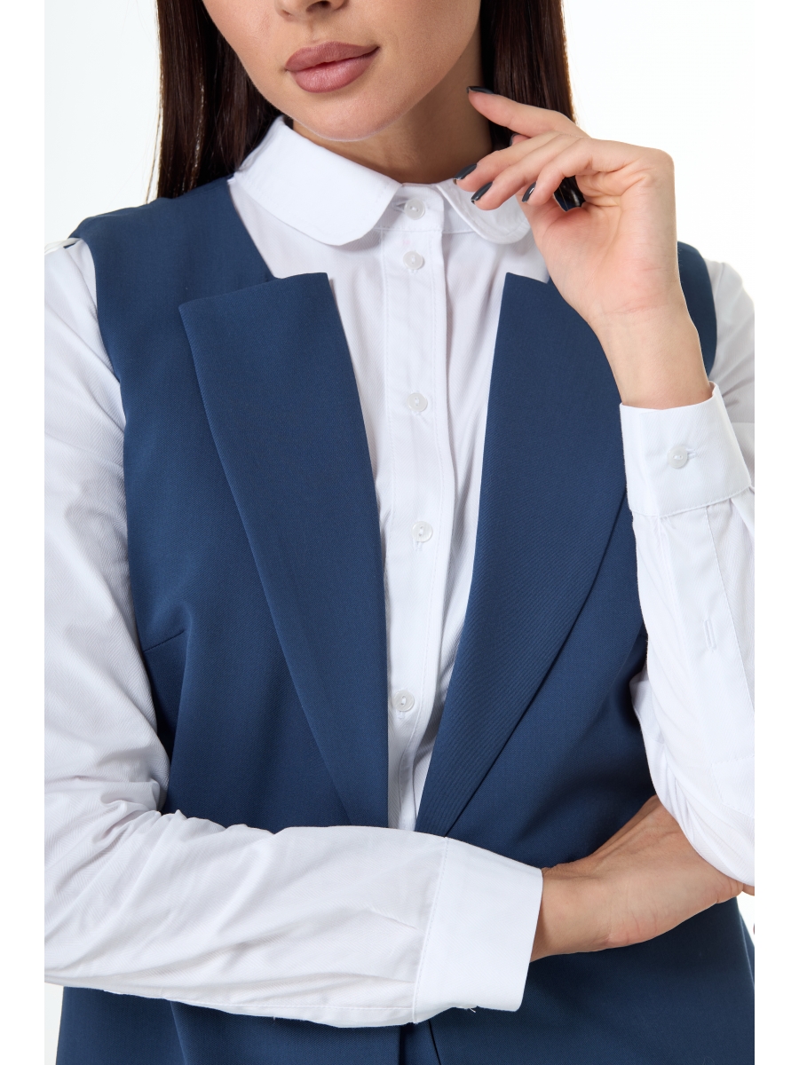 При съемках жилета темно-бирюзового цвета – брюки 228 тех же тонов и блуза 828 белая.