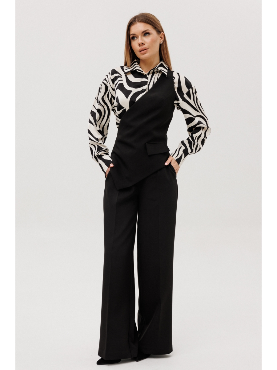 Женский жилет с уникальным асимметричным дизайном, объединяющим классическую элегантность и современные детали. Основная часть выполнена в насыщенном черном цвете, что придает изделию универсальность. В качестве контраста используется ткань с мелким геометрическим принтом в черно-белом цвете, добавляющая жилету изысканности. Декоративный клапан на передней части подчеркивает изысканный вкус, а фигурный низ добавляет игривости и женственности. Застежка на разъемную молнию, расположенная в боковом шве, обеспечивает удобство при надевании и снимании, делая модель практичной в повседневной носке.