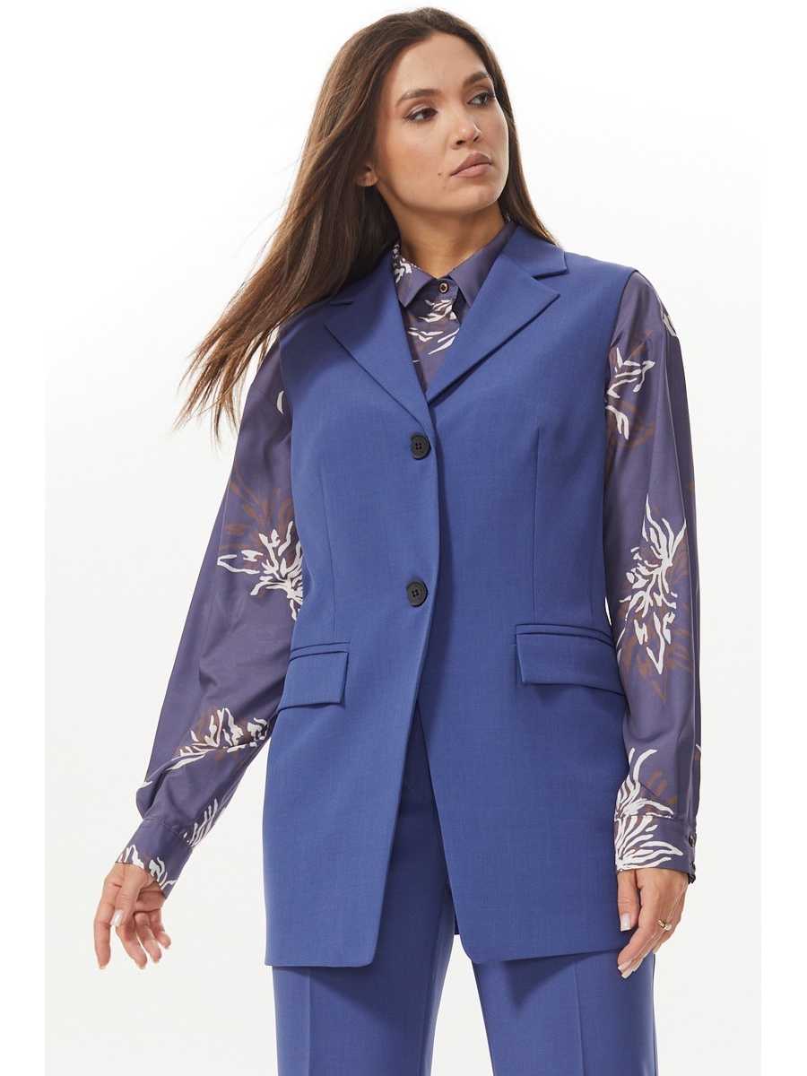 Жилет полуприлегающего силуэта с воротником пиджачного типа и однобортной застежкой на две петли и пуговицы. Полочка с вертикальными вытачками и функциональными прорезными карманами с клапаном. Спинка со средним швом. Жакет на подкладке.