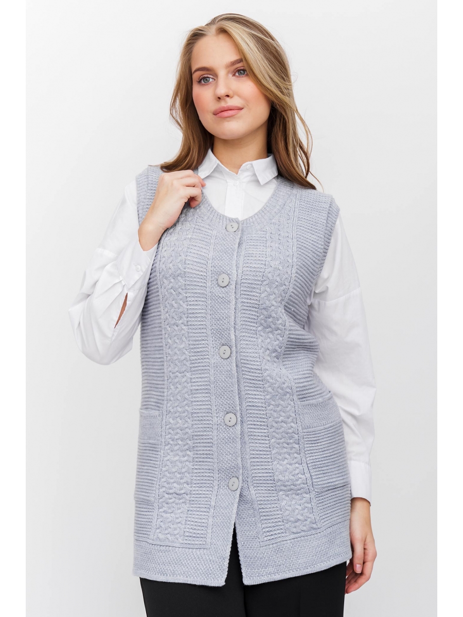Женский вязаный удлиненный жилет на пуговицах с круглой горловиной. Теплая жилетка выполнена из высококачественной пряжи с составом 50% шерсть, 50% ПАН. Трикотажный жилет застегивается на пуговицы по всей длине изделия. Длина жилета 80 см. Вязаная жилетка имеет два функциональных накладных кармана. Жилет выполнен переплетением образующим рельефный рисунок. Горловина и проймы изделия обработаны эластичным переплетением. Полуприталенный крой модели подойдет для любого типа фигуры и дополнит образ в сочетании с любой одеждой. Жилет можно носить поверх платья, блузки в комплекте с юбкой, брюками или джинсами. Натуральный состав жилетки, дарит изделию мягкость и приятные тактильные ощущения.