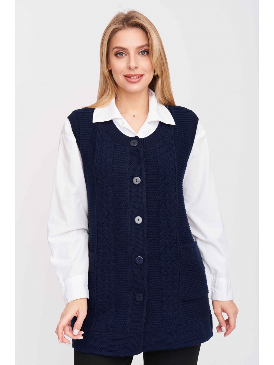 Женский вязаный удлиненный жилет на пуговицах с круглой горловиной. Теплая жилетка выполнена из высококачественной пряжи с составом 50% шерсть, 50% ПАН. Трикотажный жилет застегивается на пуговицы по всей длине изделия. Длина жилета 80 см. Вязаная жилетка имеет два функциональных накладных кармана. Жилет выполнен переплетением образующим рельефный рисунок. Горловина и проймы изделия обработаны эластичным переплетением. Полуприталенный крой модели подойдет для любого типа фигуры и дополнит образ в сочетании с любой одеждой. Жилет можно носить поверх платья, блузки в комплекте с юбкой, брюками или джинсами. Натуральный состав жилетки, дарит изделию мягкость и приятные тактильные ощущения.