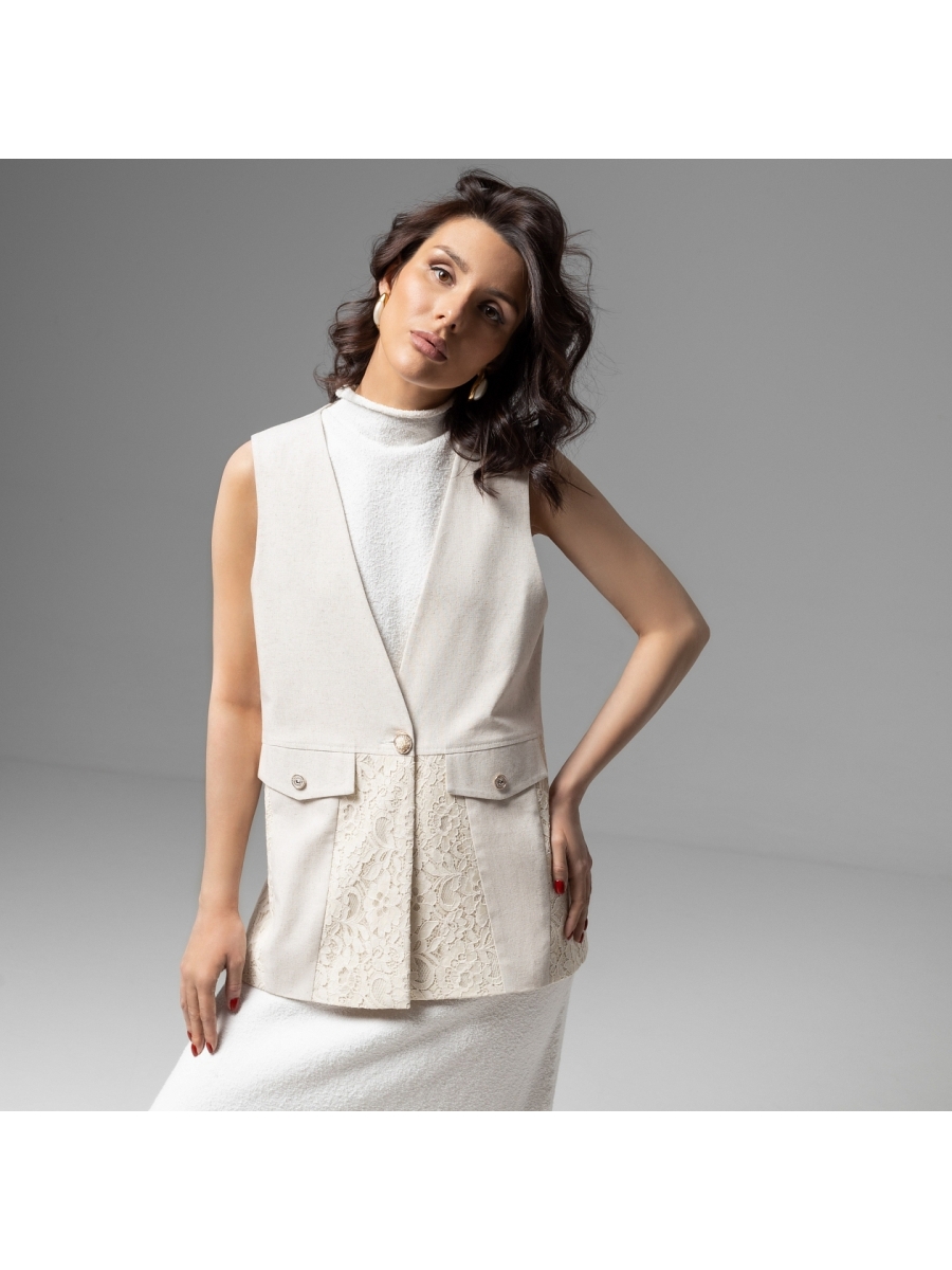 Истинное воплощение стиля old money. Оттенок, посадка и силуэт жилета премиальной коллекции CHARUTTI говорят о роскошном вкусе его обладательницы. Жилет прямого кроя. Дополнен кружевом. Эксклюзивная фурнитура. Имитация карманов. Есть подклад из шелковистого материала.