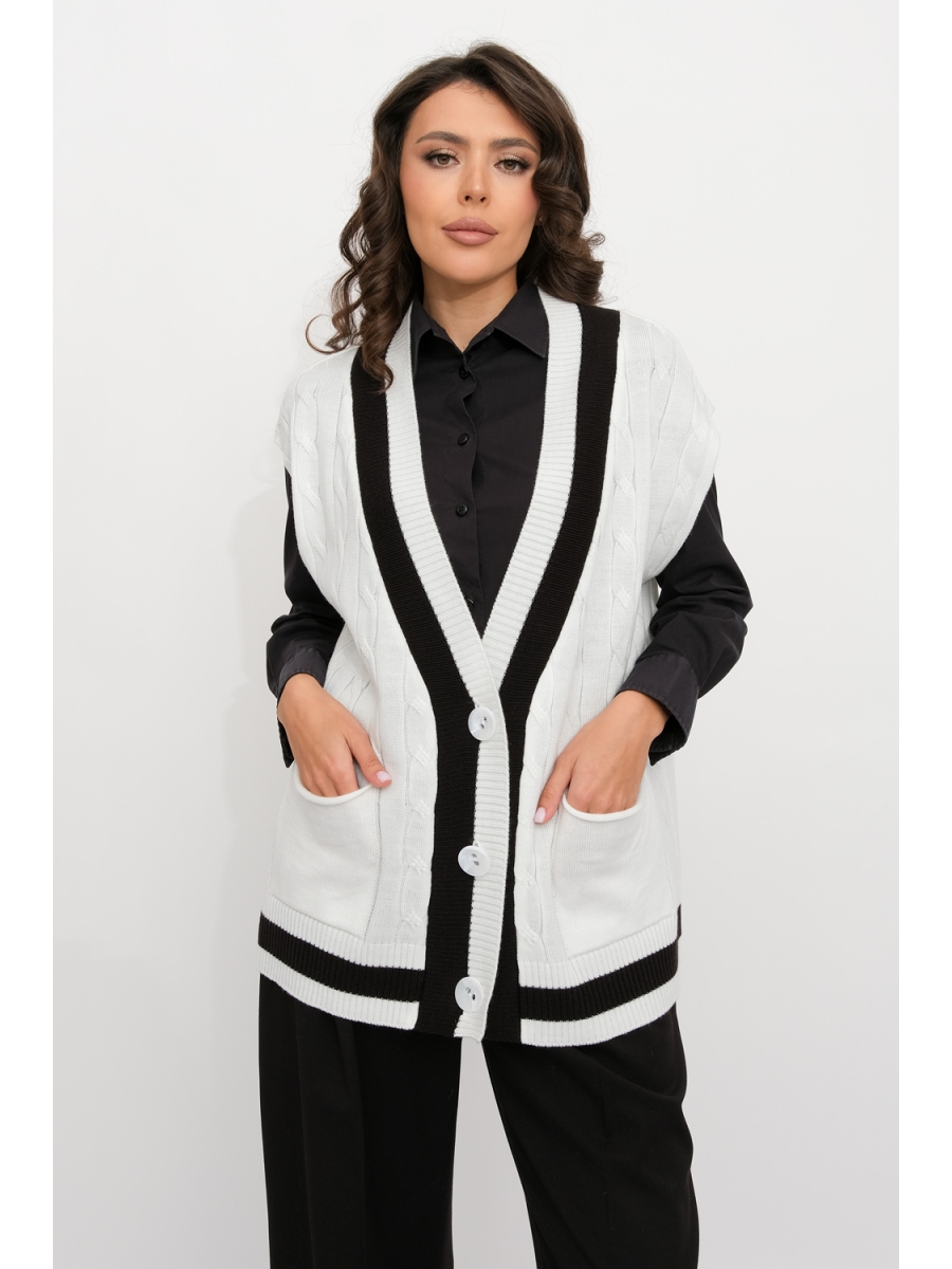 Вязаный жилет свободного силуэта V-образным вырезом горловины и двумя накладными карманами. Жилет застегивается на три крупные пуговицы. Плечо спущенное. Изделие выполнено переплетением, образующим крупные вертикальные косы. Низ изделия, горловина и борта вывязаны контрастной черно-белой резинкой.