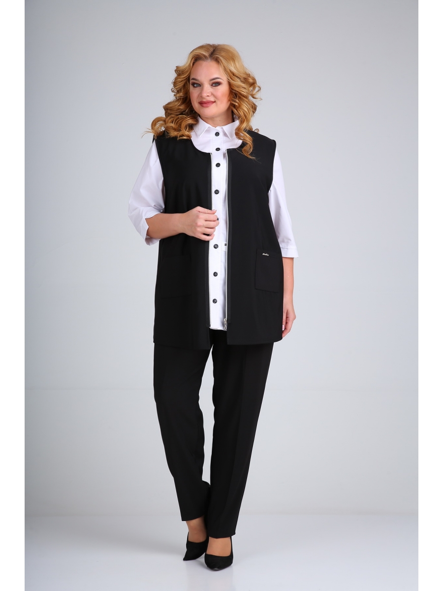Жилет женский полуприлегающего силуэта, без рукавов. Перед с нарудными вытачками, выходящими из бокового шва. Застежка центральная, на тесьму-молнию. Проймы и горловина обработаны косыми бейками. Перед с функциональными накладными карманами. Спинка со средним швом. По низу боковых швов обработаны разрезы.