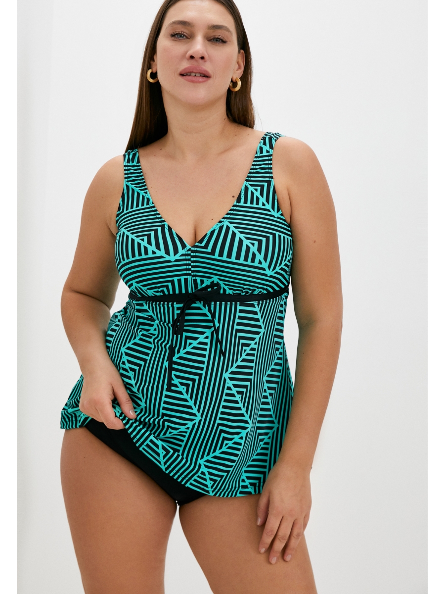 Купальник танкини большого размера подойдет для полных и взрослых женщин. Танкини регулируется кулиской для поддержки и регулировки объема, на широких бретельках. Плавки закрытые, на поясе.