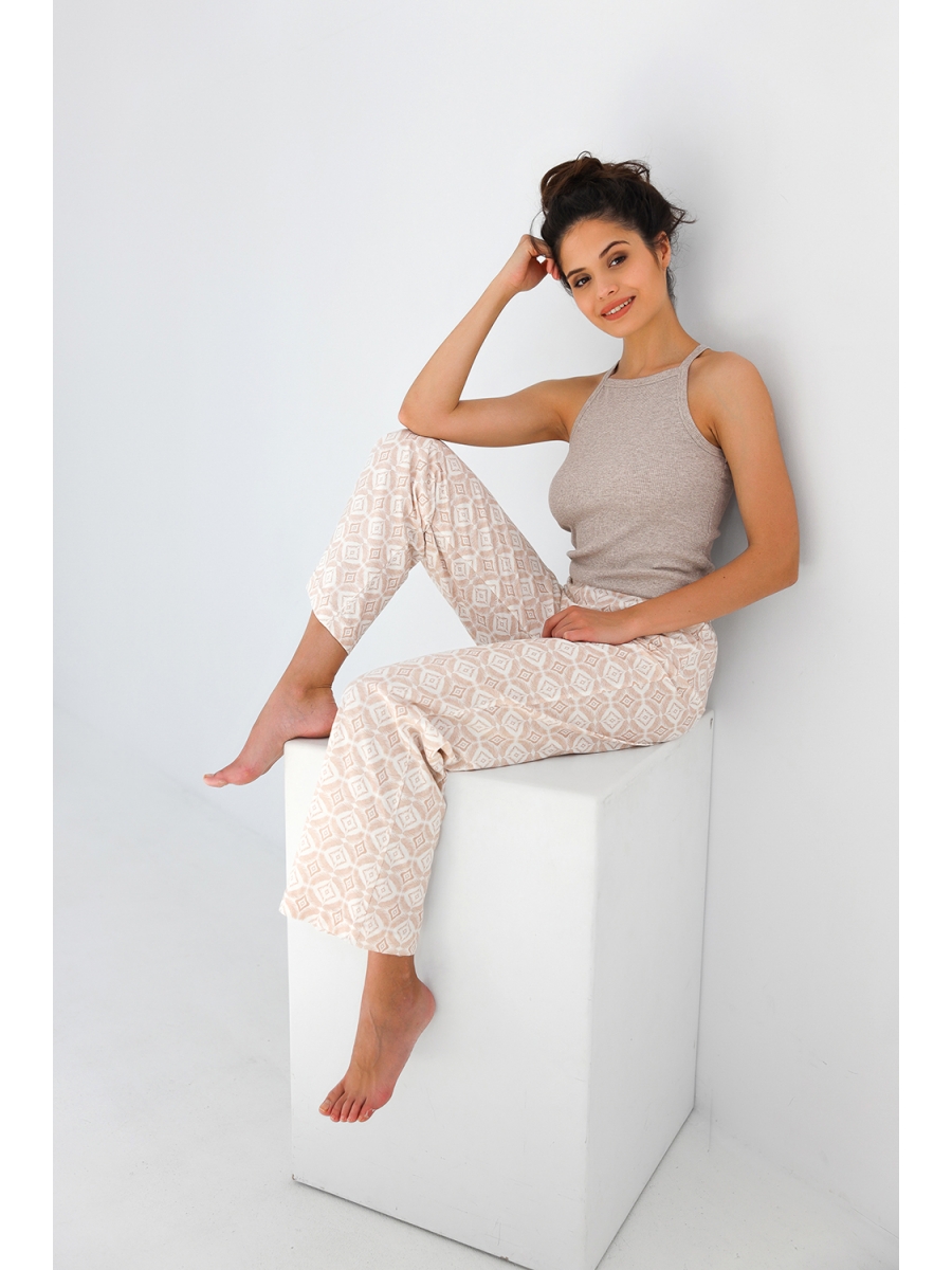 Пижама Francesca с топом в рубчик и брюками. Брюки свободного кроя с интересным геометрическим принтом. Подобный вариант пижамы идеально подойдет для теплого времени года. Состав брюк: хлопок 100%.